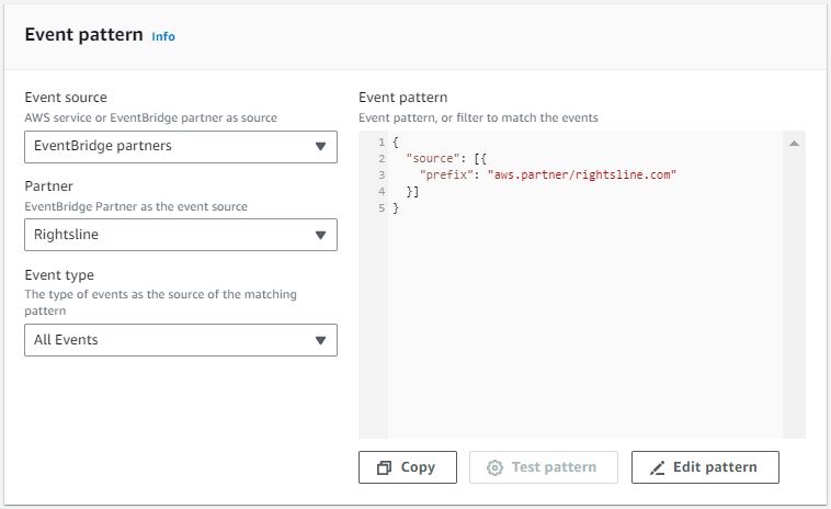 Under Event pattern, select EventBridge partners, and select Rightsline as the partner. For Event type, select All Events. Click